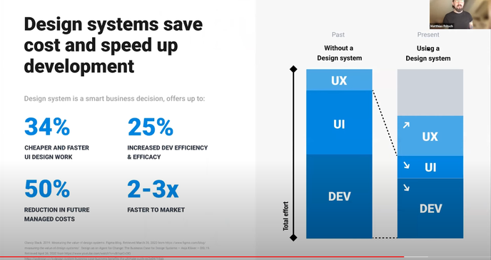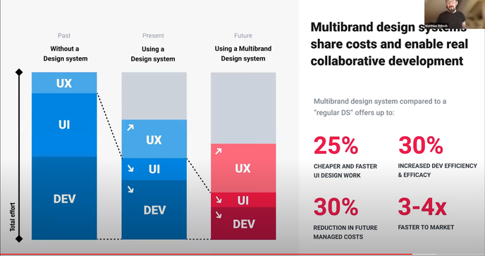 Die abgebildeten Folien veranschaulichen sehr gut, wie der kollaborative Ansatz bei Nutzung eines Designsystems hilft, Entwicklungsaufwände zu senken und den Fokus auf die eigentliche Produktentwicklung und deren UX zu verlagern.